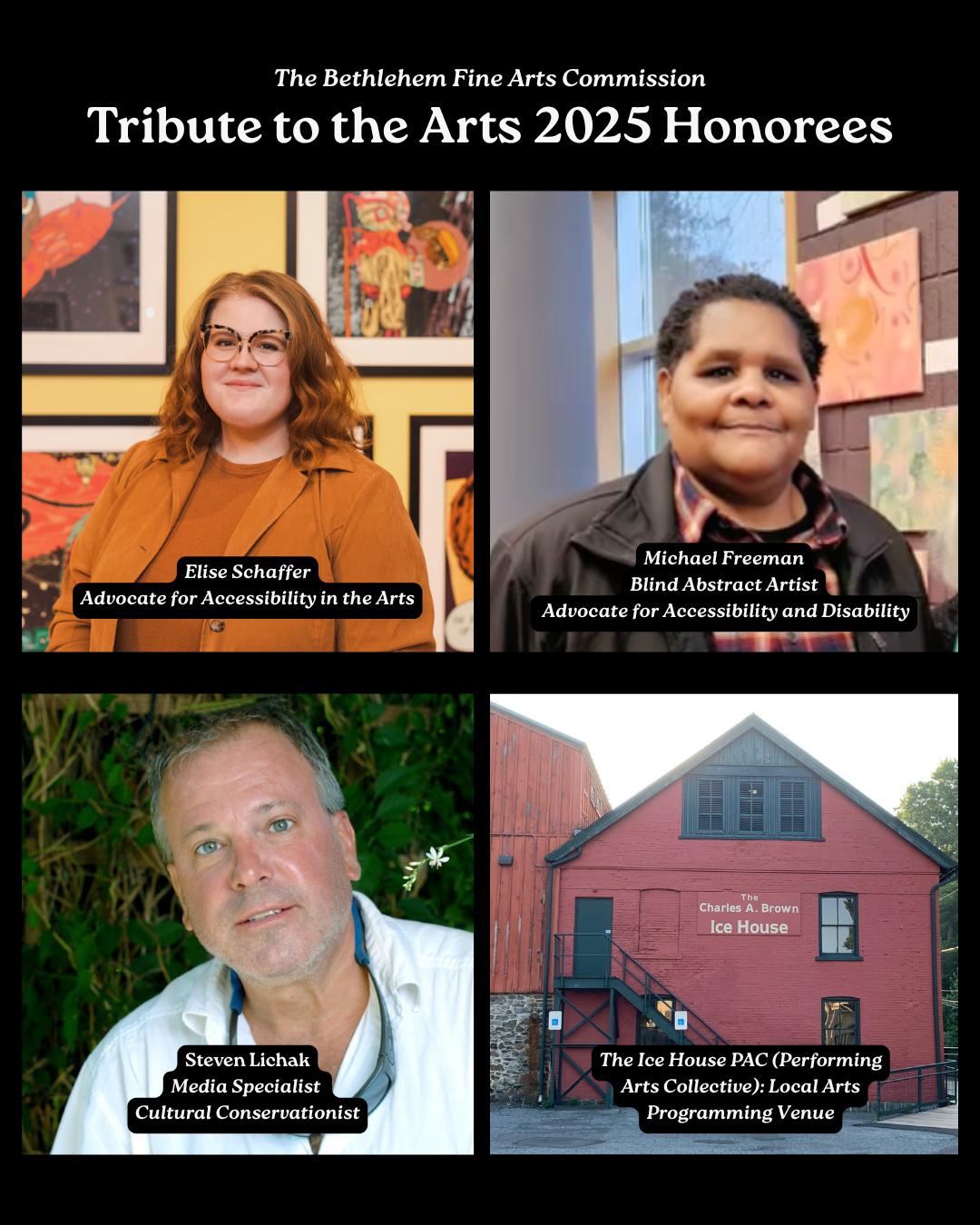 (Lehigh Valley, PA) The Bethlehem Fine Arts Commission (BFAC) is pleased to announce the 2025 Tribute to the Arts Award winners, to be honored on Tuesday, September 9th from 5:30-7:30pm at a special ceremony and reception in Bethlehem’s Historic Neighborhood District.